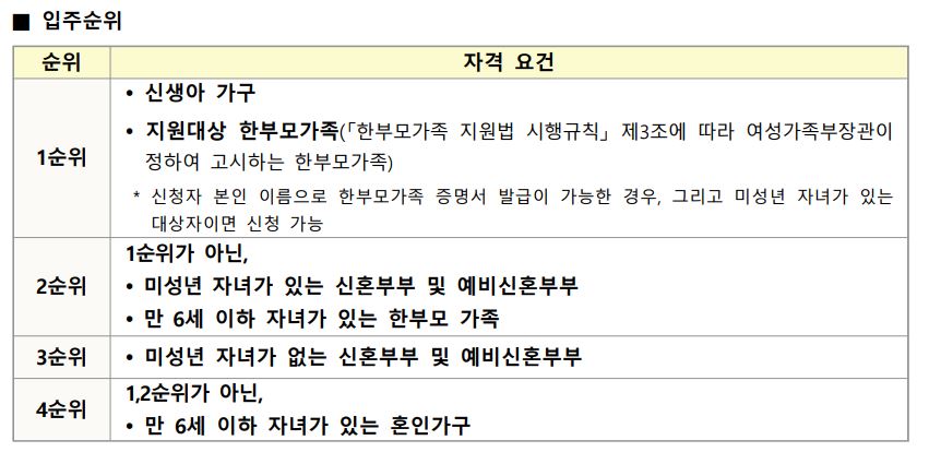 앞서 말씀드린 것과 같이 출산장려정책으로 첫 공고가 진행된 것이기 때문에 신생아 가구와 한부모 가족이 1순위 입니다. 이 순위를 확인하시는 것이 중요한 이유는 신청할 때 본인이 순위를 기입하고, 잘못 기입하여 선정이 취소되는 경우의 책임 모두가 본인에게 있기 때문에 나의 순위를 정확하게 파악하고 신청하는 것이 반드시 필요합니다.